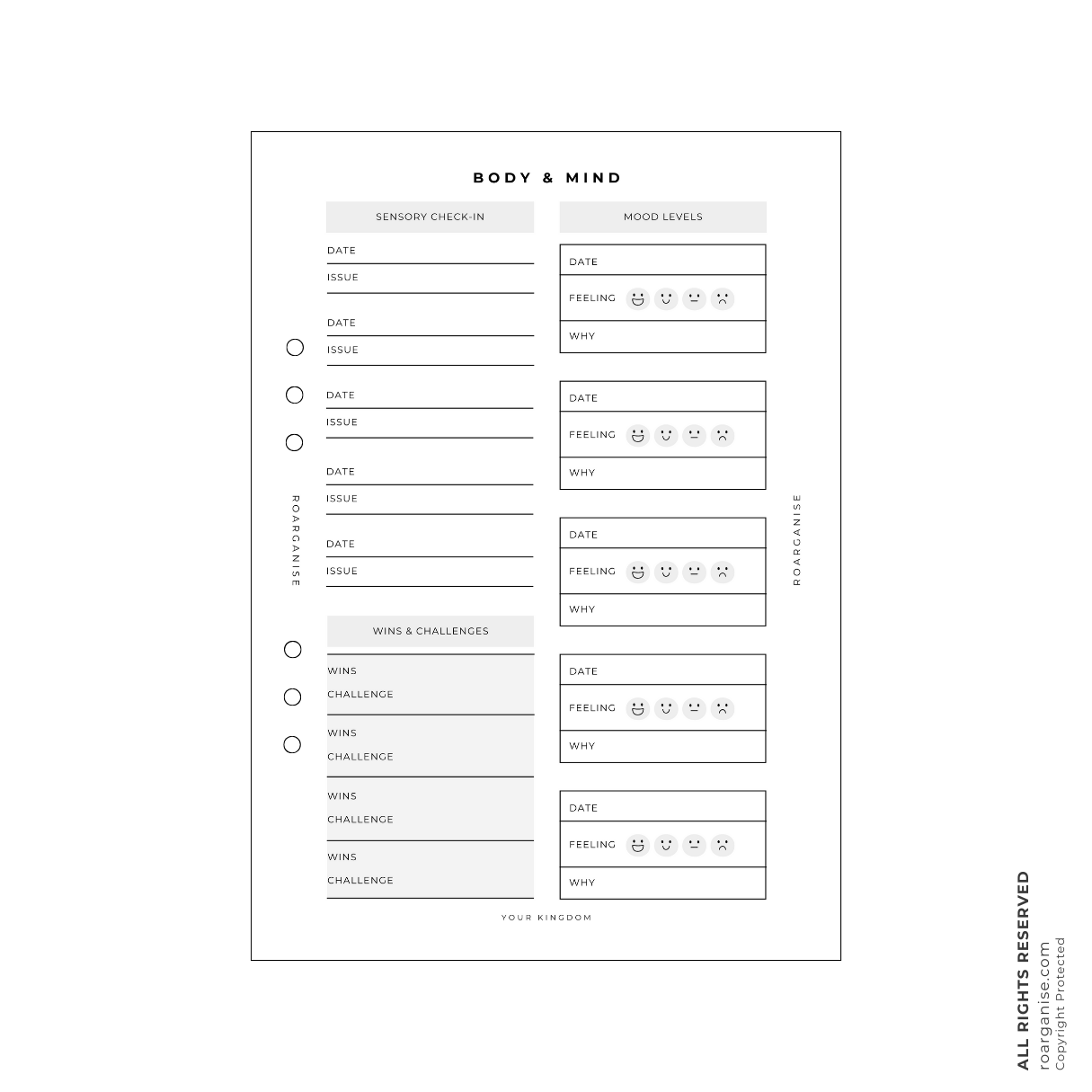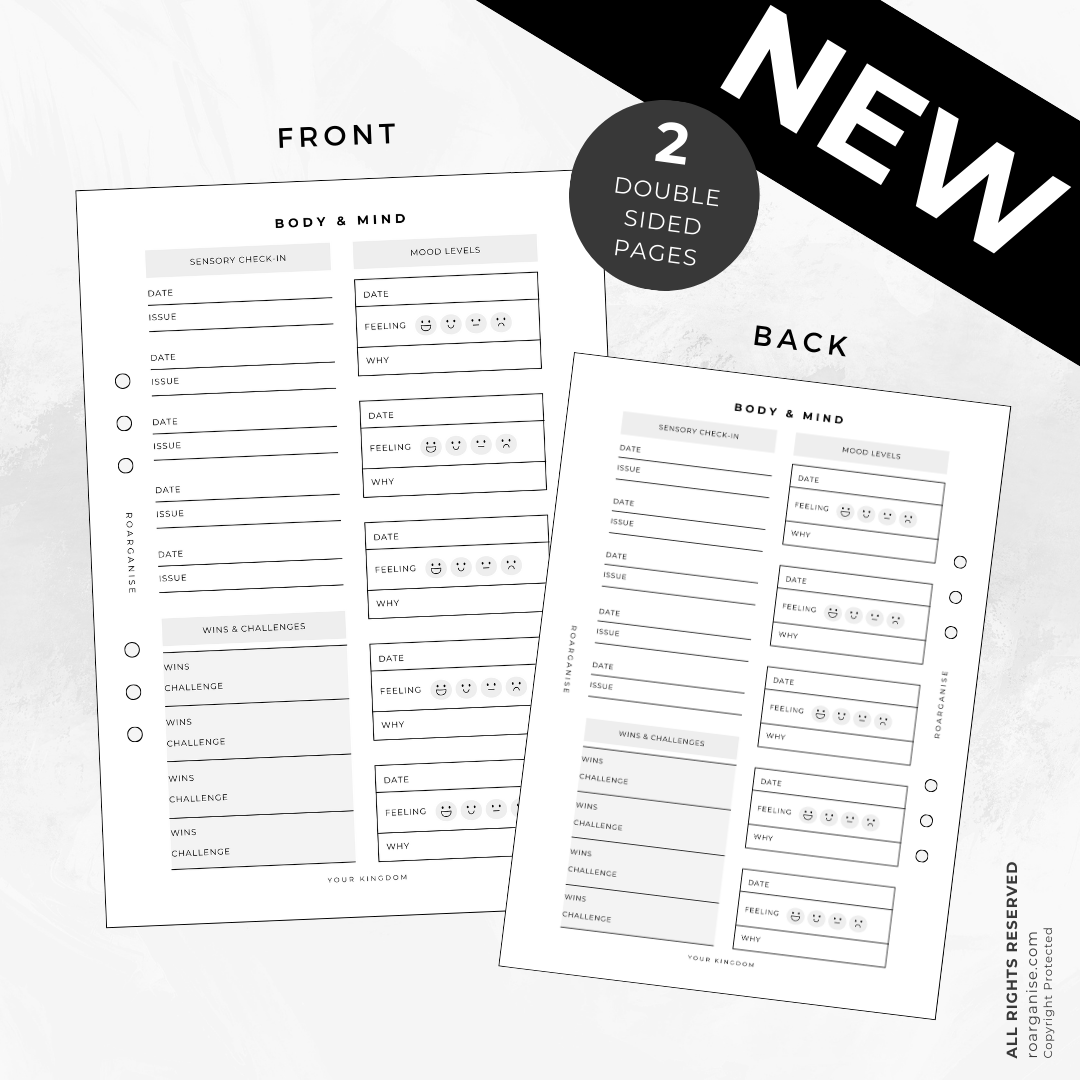 Transform your Roarganise binder into your personal wellness companion! Our Body & Mind Inserts are designed for holistic health tracking, helping you connect the dots between how you feel and what's happening in your world—perfect for anyone prioritising mental health, physical wellness, or neurodivergent minds who benefit from tracking patterns.