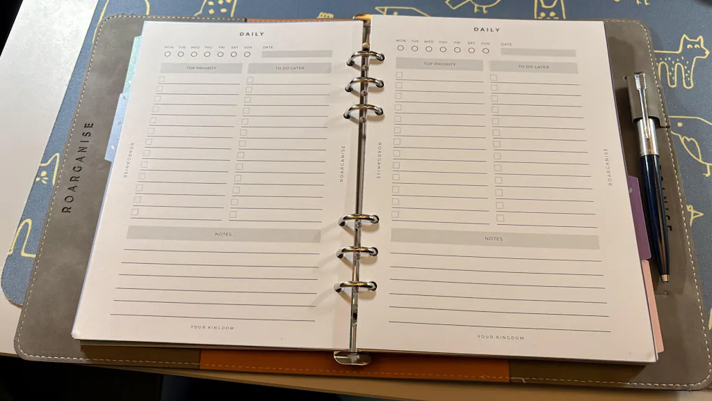 Unlike traditional diaries, Roarganisers are designed specifically for neurodivergent minds by an autistic founder with lived experience. Our modular A5 system uses high-contrast, distraction-free layouts to combat executive dysfunction. Each vegan leather cover also features a built-in stimming tool a debossed lion logo designed to help you stay grounded during your planning routine.
